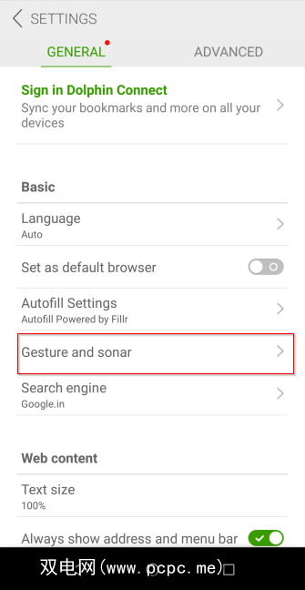 要创建新手势,请点击屏幕底部的灰色海豚图标。选择设置图标,然后转到手势和声纳。在此页面上,您可以看到一些常见网站的手势。但是,您也可以为自己喜欢的网站分配一个手势。