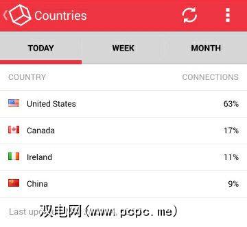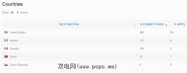 在“国家/地区"页面上,我看到了Android与哪些国家/地区进行通信。我可以根据今天的流量或过去7天或过去30天的流量查看这些摘要。毫不奇怪,美国和加拿大排在前两位,但令我惊讶的是爱尔兰和中国在榜单中。看到我的电话与中国通话总是让我对安全性有些紧张。像“组织"页面一样,我希望能够单击列出的国家/地区,查看哪些应用程序正在与这些国家/地区进行交谈。