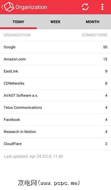点击此按钮后,系统会显示一个屏幕,显示与Android通信的前10个组织今天。或者,我可以查看最近一周甚至一个月的摘要。组织列表不足为奇-Google,Amazon和Facebook混在一起。其他组织专用于我知道我运行的应用程序以及服务提供商。我想在这里看到的是单击组织名称的功能,以查看确切的应用程序正在建立这些连接。