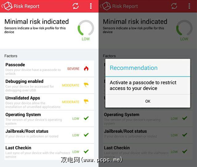 我在Android上没有密码,因此为我赢得了严重评级。启用调试功能并能够安装未经验证的应用程序,使我在所有这些因素上均获得了中等评级。拥有最新的操作系统,没有扎根我的Android以及最近通过viaProtect签入,这些因素使我获得了低评级。所有这些平均得分为低风险等级。通过利用那些被评为严重或中度的因素,我获得了有关如何解决问题的建议。