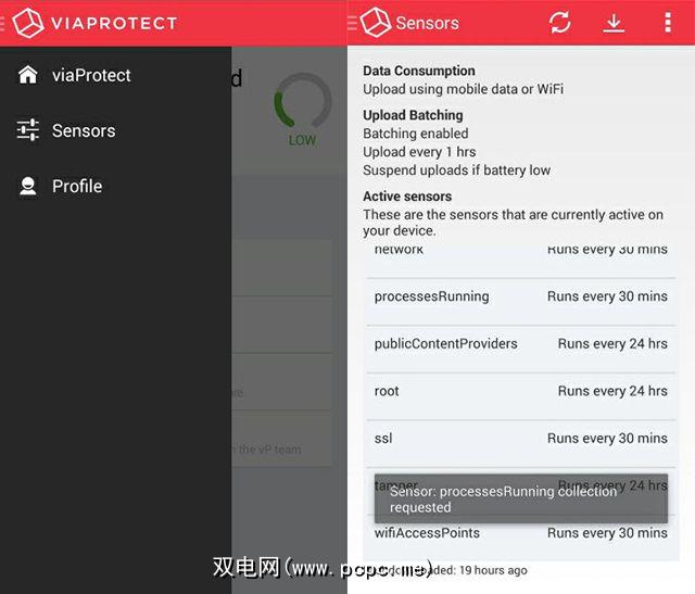 我通过点击进入传感器屏幕屏幕左上角的viaProtect图标,然后点击Sensors图标。在这里,我可以查看我的设备上通过Protect收集了哪些传感器以及收集数据的频率。