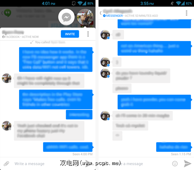 Facebook采用了非常类似于iOS7的设计,以明亮的蓝色发送您的消息,并以灰色接收消息,其中白色背景为会话。在屏幕顶部,您可以查看此人是使用Messenger还是刚在Facebook上。如果他们不在Messenger上,则会显示一个“邀请"按钮。