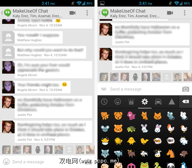 下面,您可以看到PCPC.me的组消息以及一些新的表情符号。底部略带灰色的面孔显示了对话中每个人看到的距离。顶部是视频聊天按钮,我们将在后面讨论。