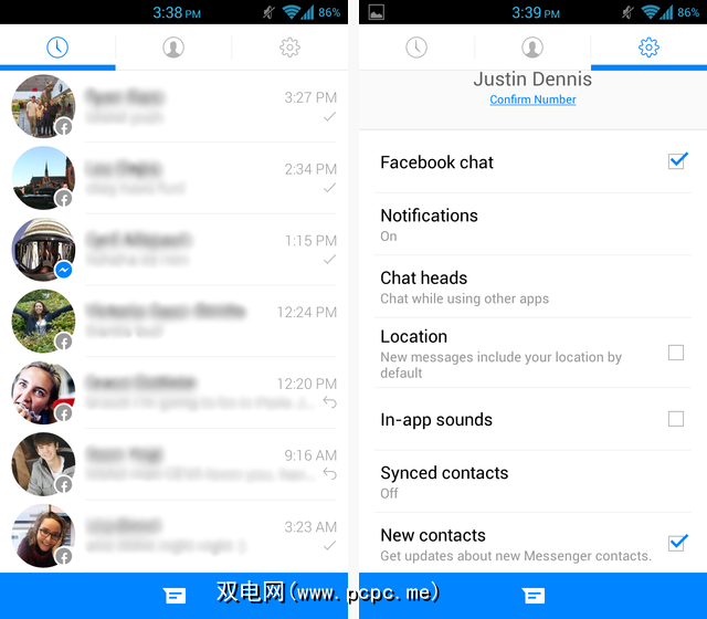 Messenger的工作方式略有不同;顶部有三个标签:最近的消息,联系人和设置。 “新消息"按钮在所有三个选项卡的底部延伸。刚拥有Facebook帐户的朋友的图片带有灰色“ f",而下载Messenger的朋友的名称带有新的蓝色Messenger徽标。