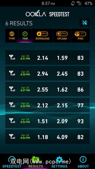 在开始测试应用之前,我们需要进行一次控制。我在洛杉矶的AT&T 4G LTE连接上运行了6个Speedtest应用程序实例,并对结果进行平均以评估在安装任何``Internet Booster''应用程序之前我的数据有多快。然后,我一步一步地下载了这些应用程序并运行它们,并确保在移至下一个应用程序之前将其完全删除。