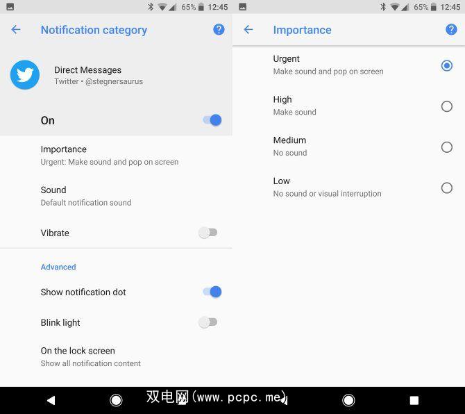 点击一个类别,然后选择重要性。在这里,您可以将重要性切换为低,中,高或紧急。如标题所示,紧急通知将发出声音并在屏幕上弹出。另一方面,低通知将不会显示在通知栏中。