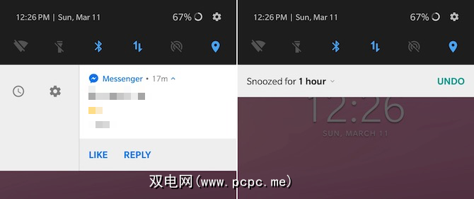 在通知上水平(略微滑动)一下,在齿轮图标旁边,您会找到一个新的时钟图标。点击它,您将获得一个选项,将通知暂停一个小时(如果需要,您可以从下拉框中选择其他时间跨度)。