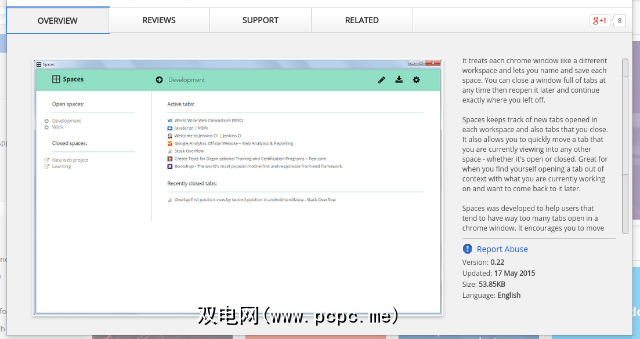 Spaces,它是一个新的Google Chrome扩展程序,旨在让您更轻松地管理打开的标签页。使用空格表示您可以将打开的选项卡分组到不同的窗口中。例如,一个窗口(或空间)可以称为“工作"并包含工作所需的物品,而另一个窗口可以称为“娱乐"并包含纯粹为娱乐而打开的物品。