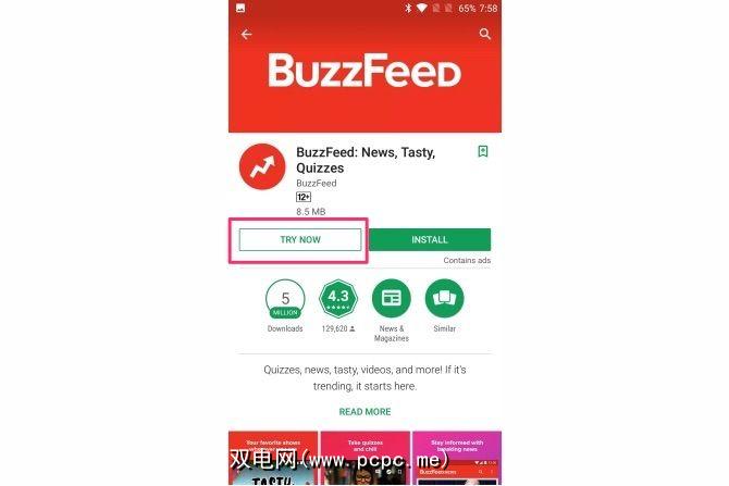 启用该功能后,只需在Play商店中搜索该应用即可。 Play商店列表目前仅支持5种应用:BuzzFeed,NYTimes,RedBull TV,OneFottball和ShareTheMeal。要尝试使用Instant App,请点击安装按钮旁边的立即尝试。