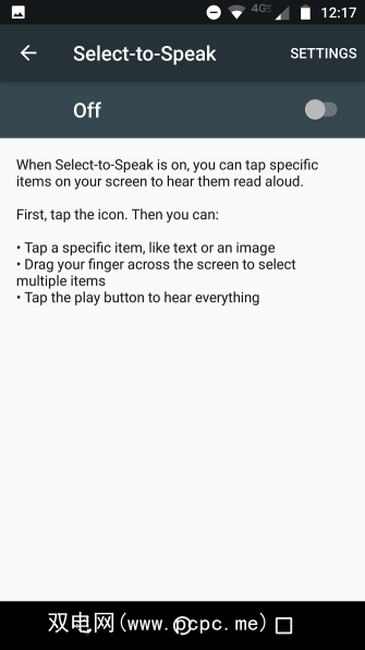Android的文本语音转换功能会自动与其他提供大声朗读功能的Google应用配合使用。对于所有其他应用,您需要在Android的设置菜单中启用讲话选择。