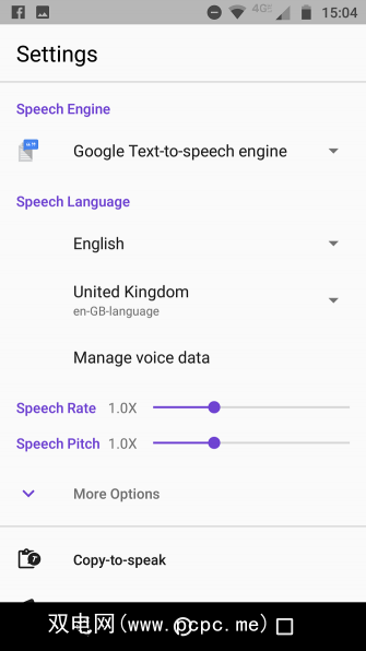 该应用程序的突出特点是存在一个简单的内置Web浏览器。 T2S的“复制到讲话"功能可以让您轻松地收听网页,而不必担心复制和粘贴URL或使用“共享"菜单。