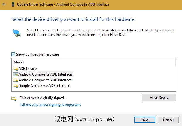 如果在该文件夹中找不到该文件夹,则可能需要搜索该文件夹。选择正确的位置后,点击下一步,Windows将安装驱动程序。从现在开始,只要您在启用ADB的情况下连接Android设备,Koush的驱动程序就会代替无法运行的驱动程序进行加载。