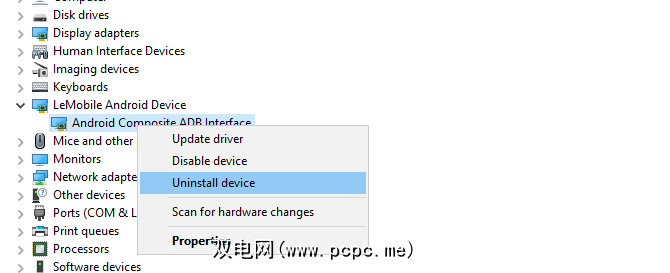 下一步,在设备管理器中,删除当前显示的Android ADB驱动程序。要删除它,请右键单击包含手机的类别,该类别可能是 LeMobile Android设备,便携式设备或类似的东西。