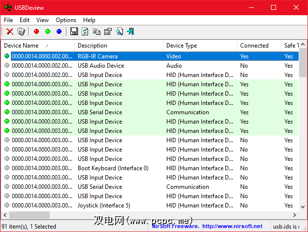 在USBDeview窗口的最左侧查找彩色状态指示器。有四种颜色。每个代表不同的状态: