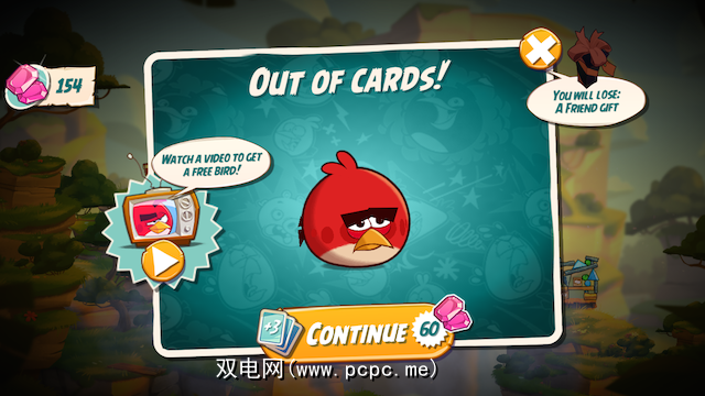 广告:除了购买外,您还可以依赖广告。例如,如果您未通过某个关卡,那么如果您愿意观看15秒的视频广告,则愤怒的小鸟2将为您提供再解锁一张卡以进行重试的缓刑。最初,我对此有些不满,并担心免费增值游戏会像《植物大战僵尸2》那样破坏游戏,但是当我玩游戏时,它已成为体验的一部分,我并不介意。也就是说,1.99美元的“全部解锁"无广告选项会带来更好的体验。
