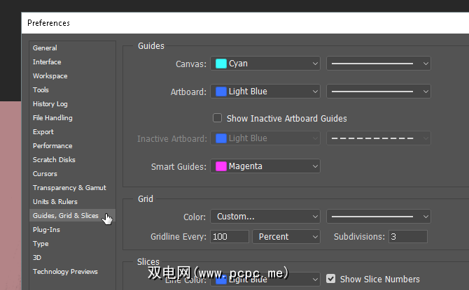 首先,按键盘上的 Ctrl + K 打开“首选项" 窗口。然后,在侧面菜单中选择指南,网格和切片选项。