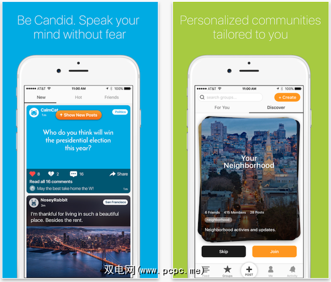 Candid是另一个应用程序,您可以在其中匿名分享您的想法。当您注册时,该应用会询问您的Facebook帐户和电话号码,但是如果您希望保持匿名,可以选择跳过。您可以创建组或加入已经存在的组。您还可以添加学校,大学或工作场所以查看最相关的内容。