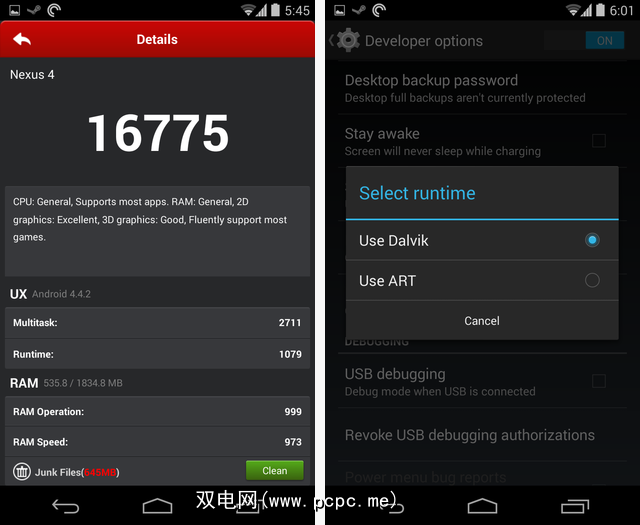 如果您深入研究Android的开发人员选项并切换到实验性ART运行时-我们不建议您在实际环境中使用此功能-您的运行时得分应会提高。这是因为较新的ART运行时在某些方面要比较早的Dalvik运行时表现更好,而该分数全都与真实性能有关。