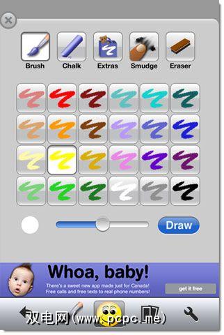 使用Doodle Buddy毫无疑问。我们回到主屏幕和四个按钮(第五个用于设置)。第一个“反向"箭头按钮用于消除您犯的任何错误,并且在任何绘图应用程序中,众所周知的很少。第二个图标用于粉笔绘图工具。这是一个,您将最常使用它来进行涂鸦,素描和绘制。至少,这是我的个人喜好。然后,您可以选择使用 Smudge 工具,从下面的色块中混合并匹配颜色。