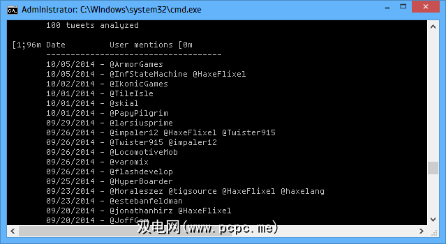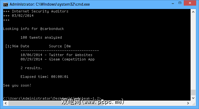 -s 参数用于查看该帐户正在使用的Twitter应用程序。我不是一个大的应用程序用户,因此结果很无聊,但是我敢肯定,在某些情况下,窥视某人的Twitter应用程序可能会很有趣或很有用。
