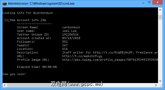 -n 参数表示我们要浏览的Twitter帐户,在这种情况下为 carbonduck 。以下 -b 参数表示我们仅对基本帐户详细信息感兴趣。