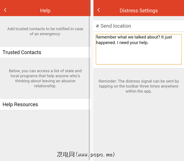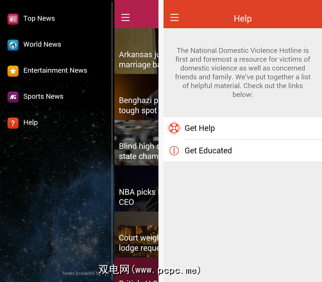 一旦您走过新闻墙,``帮助''部分就会显示该应用程序的真正用途,点击左上角的三行图标可以访问它。在这里,您可以建立紧急联系人,访问有关家庭暴力的文章,并联系可以提供真正帮助的家庭暴力预防组织。