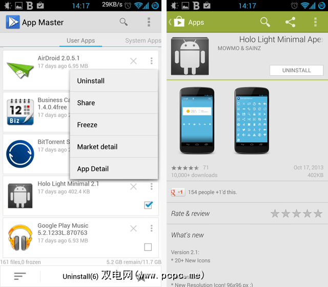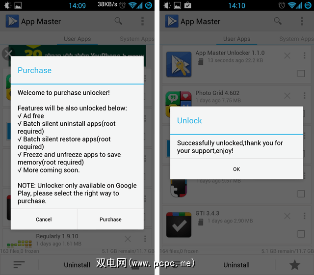 上面您还可以看到解锁器能给您带来什么。这里的重点是“批量静默卸载"功能,该功能基本上意味着您可以选择一些要删除的应用程序,而App Master可以将它们全部卸载,而不必单独确认每个应用程序(尝试清理手机时会遇到很大的麻烦) 。