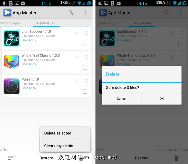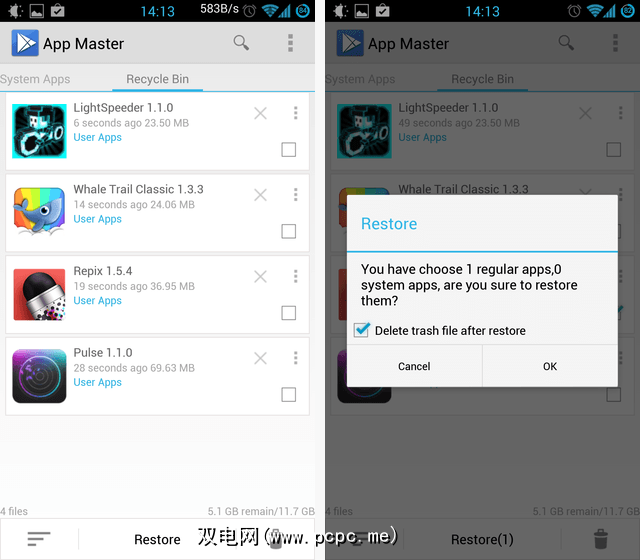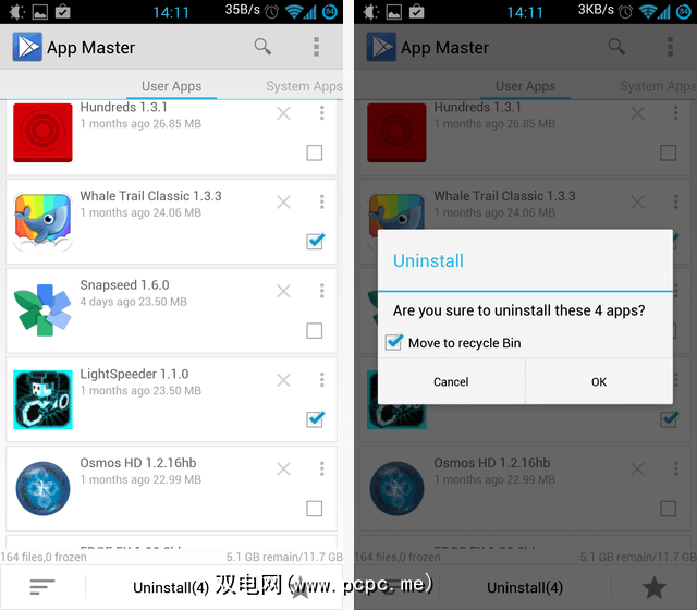 如您在上面的右侧屏幕截图中所见,App Master随后将进行确认,默认情况下提供移动将您的应用程序保存到内部的“回收站"。如果您不使用Titanium Backup,这很好,但是实际上,我希望您已经有了某种可靠的备份策略–在这种情况下,您将不需要