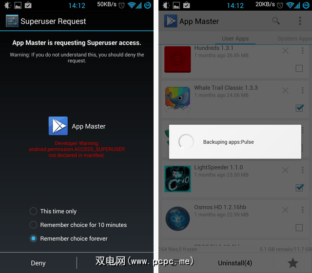 这是您第一次看到App Master提示输入root权限时-在它实际需要该权限之前照你说的做。然后,它将备份每个应用程序(如果您要求的话)并将其删除。