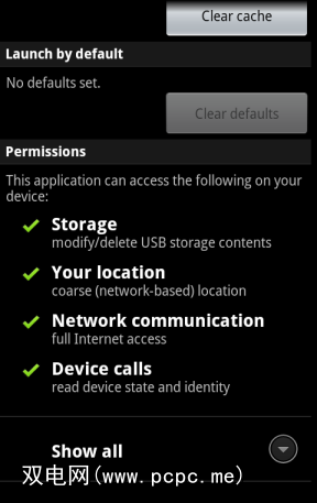 Android还允许您查看已安装应用程序的权限。为此,请点击菜单按钮,点击设置,点击应用程序,然后点击管理应用程序。点击列表中已安装的应用程序并向下滚动以查看所需的权限。