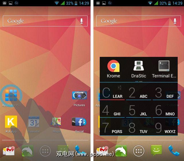 还可以将AppDialer添加到锁定屏幕。不过,在选择一个应用程序以解锁手机后,您需要输入密码。默认情况下,它会填满整个屏幕,如左侧屏幕截图所示。但是,您可以调整窗口小部件的大小,以减少其占用的空间,也许允许在其下方放置模式密码。即使最小化,启动器也易于使用。