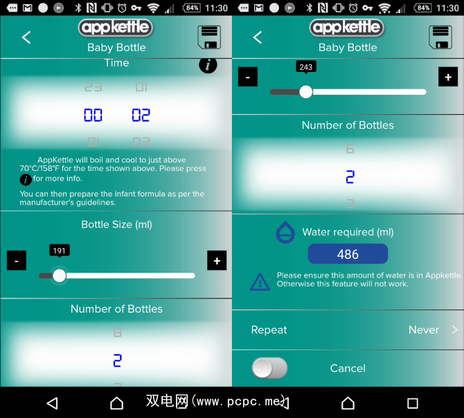 为向您展示AppKettle的出色表现,下面介绍了为婴儿奶瓶准备水的选项。选择“婴儿奶瓶"选项后,您只需要设置准备时间,奶瓶尺寸和所需奶瓶数量即可。保存后,AppKettle会将水煮沸并将其冷却至70°C / 158°F左右。虽然对宝宝来说太热了,但这是制作配方奶所需的温度。 (此后,当然需要一些冷却才能达到安全温度。)