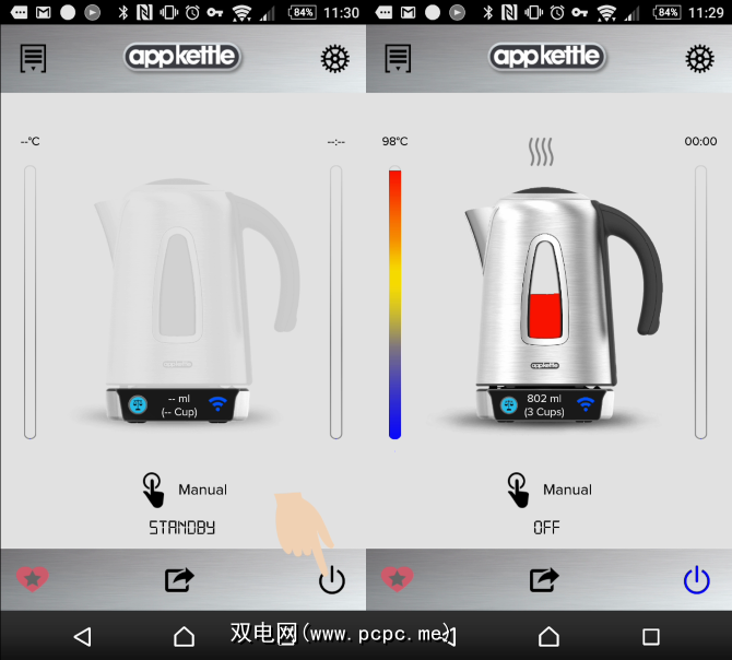 首先请确保已连接应用程序和水壶。打开应用程序,然后在主屏幕上,点击右下角的“待机"按钮。立即,您会看到AppKettle中有多少水,这是基本设备中技术的精确表示。