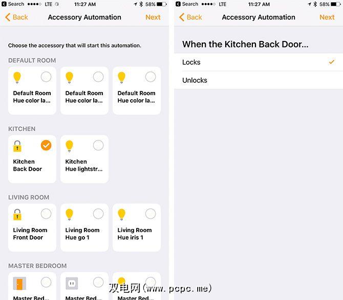 要自定义此选项,请从“自动化"部分中选择它。首先,您将选择启动自动序列的附件(通常是锁或灯)。它只能是一个配件。在下一个屏幕上,您可以选择在锁定或解锁或打开门或打开或关闭灯时是否开始自动化。最后,您将能够选择要与之交互的场景或设备。