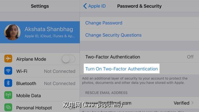 在iOS上:在设置应用,点击顶部的您的姓名/ Apple ID,然后点击密码和安全性。在下一部分中,您将找到启用两层身份验证选项以继续执行2FA流程。