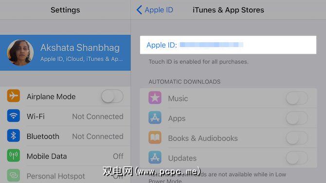 在iOS上: 在“设置" 应用程序顶部点击您的名字。在下一个屏幕上,即 Apple ID 屏幕上,您应该在名称下方看到Apple ID。在此屏幕上点击 iTunes&App Store ,您还将在下一个屏幕的顶部看到您的Apple ID。