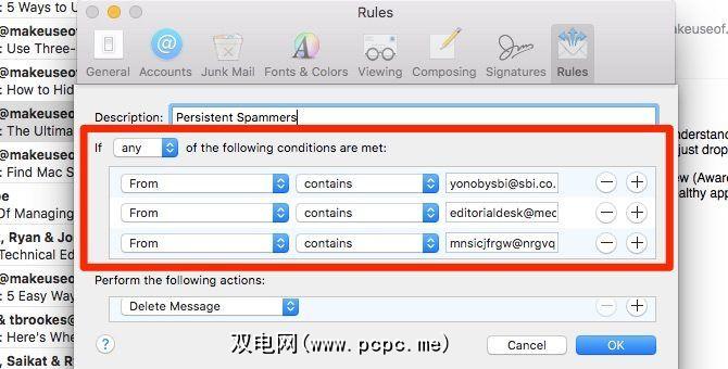 此规则对于摆脱垃圾邮件也很有用。发送给例如家人的转发邮件的数量。当然,如果您不想接收此类消息,最好让发件人知道。如果这不可能或不起作用,请让Mail过滤出这些消息并为您删除它们。