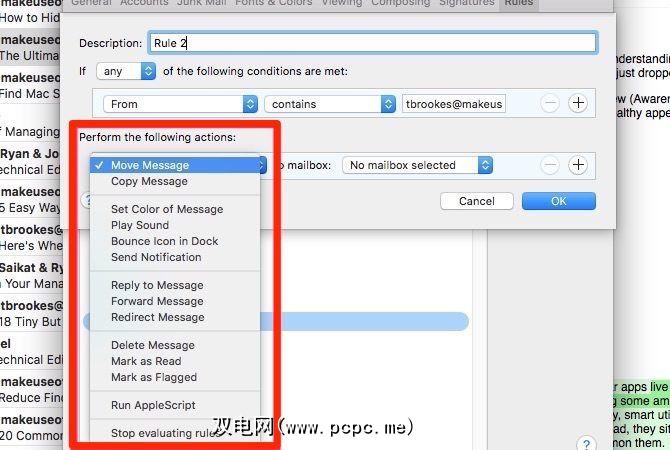 下一步,您告诉Mail在找到与您添加的条件匹配的电子邮件时执行某些操作。您会在执行以下操作下拉菜单中看到可用的操作。