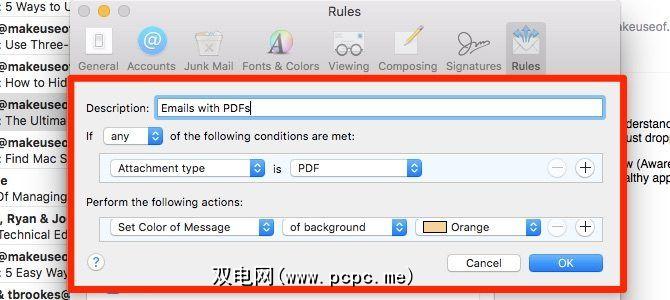 设置条件以匹配附件类型为 PDF ,并使用移动邮件操作可隔离包含PDF的电子邮件。如果要突出显示电子邮件而不是将其移动到单独的文件夹,请使用设置邮件颜色操作。