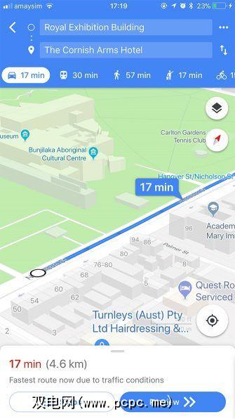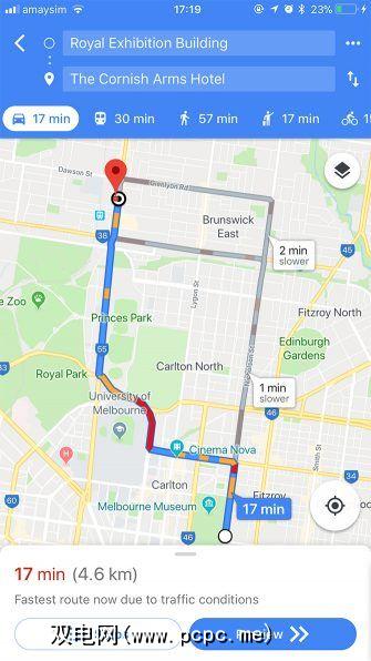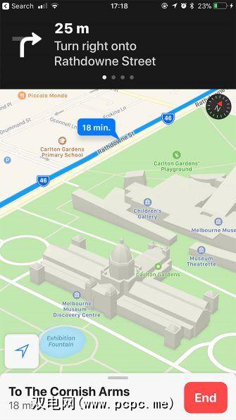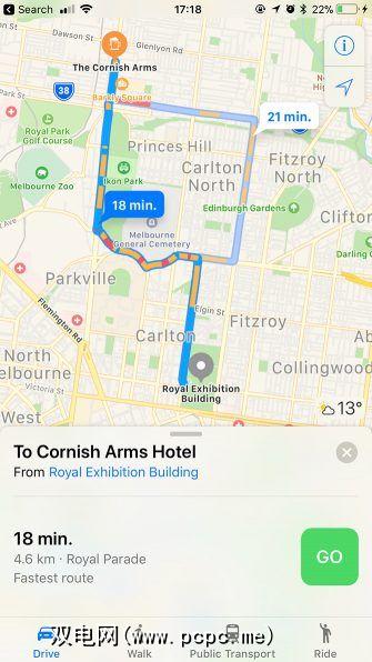 Google Map和Apple Maps均提供了带有转弯导航的步行,公共交通和行车路线。 (Google还为骑自行车的人提供支持,我们将在后面讨论)。