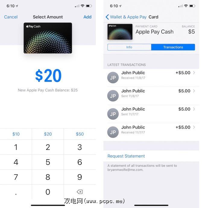 在Apple Pay Cash屏幕上,您可以从此屏幕将钱添加到虚拟Cash卡中。在“交易"下,您还将看到以前的Apple Pay Cash交易的运行清单。