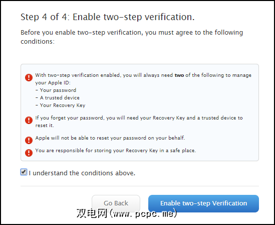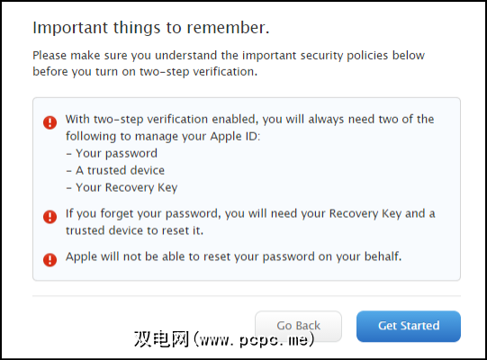 因此请注意以下警告:如果出于任何原因将两步关闭,您很可能会在几天之内被锁定为Apple帐户的“安全措施"。