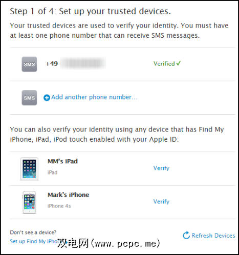 您的电话号码应在页面顶部显示为 Verified 。如果是,那就好。这将是所有Apple两步编号将使用的号码。您还可以在此步骤中通过单击所选设备旁边的 Verify 来添加其他iOS设备,例如iPhone和iPad。