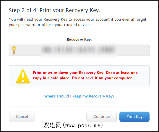 Apple认识到有时您无法访问您的电话号码或其他设备来验证您的身份。在这种情况下,您将获得一个``恢复密钥'',它将恢复对您帐户的访问权限。您必须打印此号码,将其保存在密码柜中或写下来。立即记录下来。