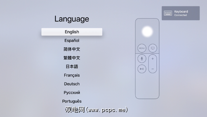 键盘符号将在屏幕上闪烁,以确认键盘已准备就绪。使用箭头键在屏幕上移动,然后使用Enter按钮进行选择。选择语言和国家/地区后,将出现另一个屏幕,允许您选择是否在Siri遥控器上使用Siri和听写。