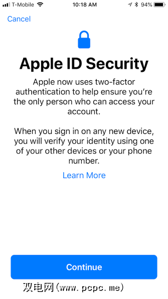 在密码和安全性屏幕上,点击启用双向身份验证。 。您会看到一个 Apple ID安全性屏幕。点击继续,然后输入您的电话号码以及您要如何验证(短信或电话)。