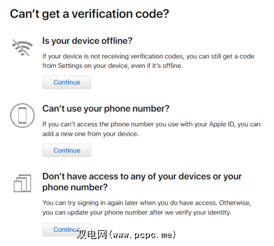 如果您无法收到两因素身份验证验证代码,则表示需要使用另一种方法来访问您的Apple ID帐户。