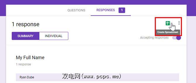 返回到编辑器窗口,单击回复,然后单击Google表格图标以用您的回复创建一个新的Google表格。