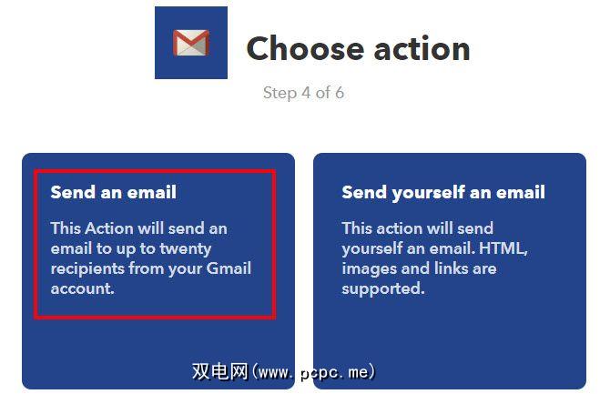 下一步,单击那个 IFTTT链接。搜索 Gmail ,然后选择发送电子邮件作为操作。