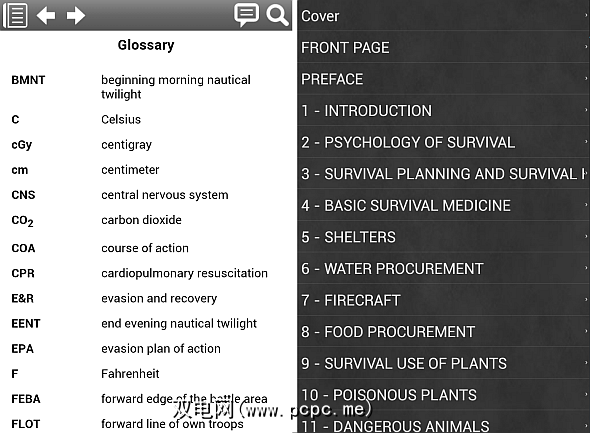 陆军生存指南FM3-05.70:该指南包含重要的生存信息,从接触食物到寻找可食用食物的方法,不一而足。它最突出的功能包括搜索工具,索引和总的脱机访问权限。